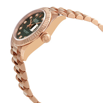 18k everose gold case with a 18k everose gold Rolex President bracelet. Fixed fluted 18k everose gold bezel. Green dial with rose gold hands and diamond hour markers. Dial Type: Analog. Date display at the 3 o'clock position. Rolex Calibre 2236 Automatic movement, based upon Rolex 2235, containing 31 Jewels, bitting at 28800 vph, and has a power reserve of approximately 55 hours. Scratch resistant sapphire crystal. Screw down crown. Screw down case back. Round case shape. Case size: 28 mm. Fold over clasp. Water resistant at 100 meters / 330 feet. Functions: date, hour, minute, second. Lady-datejust Series. Dress watch style. Watch label: Swiss Made. Rolex Lady-Datejust Automatic Diamond Green Dial Ladies Watch 279175GNDP.