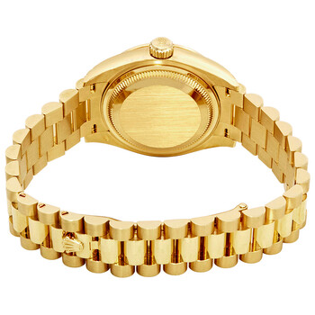 18kt yellow gold case with a 18kt yellow gold rolex president bracelet. Fixed 18kt yellow gold bezel set with diamonds. Champagne dial with yellow gold hands and diamond hour markers. Diamond-set roman numeral appears at the 9 o'clock position. Dial Type: Analog. Date display at the 3 o'clock position. Rolex calibre 2236 automatic movement, based upon Rolex 2235, containing 31 Jewels, bitting at 28800 vph, and has a power reserve of approximately 55 hours. Scratch resistant sapphire crystal. Screw down crown. Solid case back. Round case shape. Case size: 28 mm. Fold over clasp. Water resistant at 100 meters / 330 feet. Functions: date, hour, minute, second. Lady Datejust 28 Series. Luxury watch style. Watch label: Swiss Made. Rolex Lady-Datejust Champagne Diamond Dial 18kt Yellow Gold President Watch 279138CRDP.