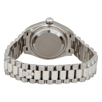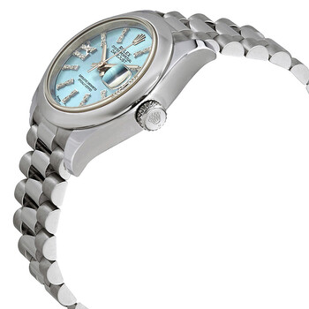 Platinum case with a platinum rolex president bracelet. Fixed, domed platinum bezel. Ice blue dial with silver-tone hands and Roman- index numerals hour markers. Dial Type: Analog. Date display at the 3 o'clock position. Rolex Calibre 2236 automatic movement with a 55-hour power reserve. Scratch resistant sapphire crystal. Screw down crown. Solid case back. Round case shape. Case size: 28 mm. Water resistant at 100 meters / 330 feet. Functions: date, hour, minute, second. Luxury watch style. Watch label: Swiss Made. Rolex Lady-Datejust Ice Blue Diamond Dial Ladies Platinum President Watch 279166IBLRDP.