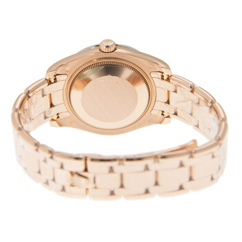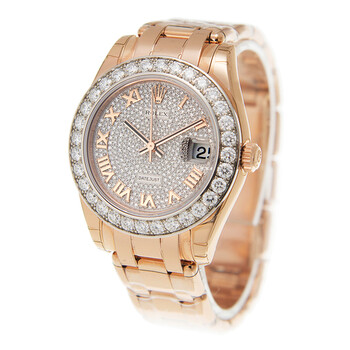 18k everose gold case with a 18k everose gold rolex pearlmaster bracelet. 18k white gold set with 32 diamonds bezel. Diamond pave dial with rose gold-tone hands and Roman numeral hour markers. Dial Type: Analog. Date display at the 3 o'clock position. Automatic movement. Scratch resistant sapphire crystal. Screw down crown. Case diameter: 34 mm. Round case shape. Concealed crown clasp. Water resistant at 100 meters / 330 feet. Functions: date, hour, minute, second. Luxury watch style. Watch label: Swiss Made. Rolex Lady-Datejust Pearlmaster Diamond Pave Dial 18K Everose Gold Automatic Ladies Watch 81285CDRPM.