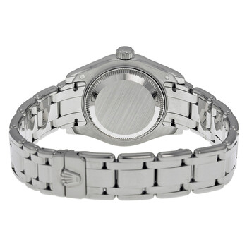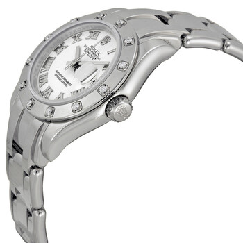 18kt white gold case with a 18kt white gold rolex pearlmaster bracelet. Fixed 18kt white gold 12 diamond set bezel. White dial with silver-tone hands and Roman numeral hour markers. Dial Type: Analog. Date display at the 3 o'clock position. Rolex Calibre 2235 Automatic movement, containing 31 Jewels, bitting at 28800 vph, and has a power reserve of approximately 48 hours. Scratch resistant sapphire crystal. Screw down crown. Solid case back. Round case shape. Case size: 29 mm. Concealed crown clasp. Water resistant at 100 meters / 330 feet. Functions: date, hour, minute, second, chronometer. Luxury watch style. Watch label: Swiss Made. Item Variations: 80319PM, Rolex-80319PM 80319, 80319-PM, Rolex-80319, Rolex-80319-PM. Rolex Lady-Datejust Pearlmaster White Dial 18K White Gold Automatic Ladies Watch 80319WRPM.