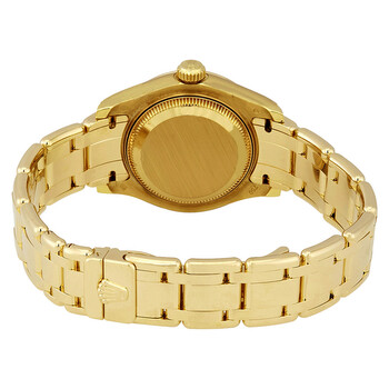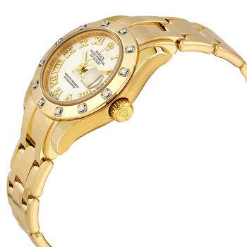 18kt yellow gold case with a 18kt yellow gold rolex pearlmaster bracelet. Fixed 18kt yellow gold 12 diamond set bezel. White dial with yellow gold-tone hands and Roman numeral hour markers. Dial Type: Analog. Date display at the 3 o'clock position. Rolex Calibre 2235 Automatic movement, containing 31 Jewels, bitting at 28800 vph, and has a power reserve of approximately 48 hours. Scratch resistant sapphire crystal. Screw down crown. Solid case back. Round case shape. Case size: 29 mm. Concealed crown clasp. Water resistant at 100 meters / 330 feet. Functions: date, hour, minute, second, chronometer. Luxury watch style. Watch label: Swiss Made. Item Variations: 80318PM, Rolex-80318PM 80318, 80318-PM, Rolex-80318, Rolex-80318-PM. Rolex Lady-Datejust Pearlmaster White Dial 18K Yellow Gold Automatic Ladies Watch 80318WRPM.