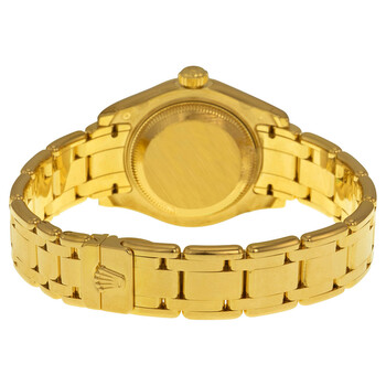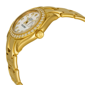 18kt yellow gold case with a 18kt yellow gold rolex pearlmaster bracelet. Fixed 18kt yellow gold 32 diamond set bezel. White dial with yellow gold-tone hands and diamond hour markers. Dial Type: Analog. Date display at the 3 o'clock position. Rolex Calibre 2235 Automatic movement, containing 31 Jewels, bitting at 28800 vph, and has a power reserve of approximately 48 hours. Scratch resistant sapphire crystal. Screw down crown. Solid case back. Round case shape, case size: 29 mm, case thickness: 11 mm. Concealed crown clasp. Water resistant at 100 meters / 330 feet. Functions: date, hour, minute, second, chronometer. Luxury watch style. Watch label: Swiss Made. Rolex Lady-Datejust Pearlmaster White Diamond Dial 18K Yellow Gold Automatic Ladies Watch 80298WDPM.