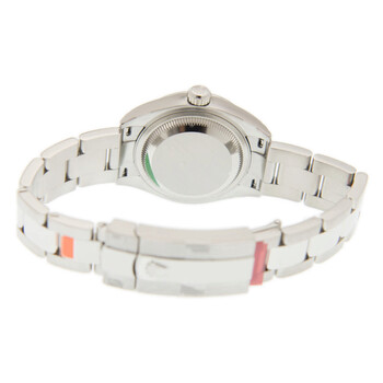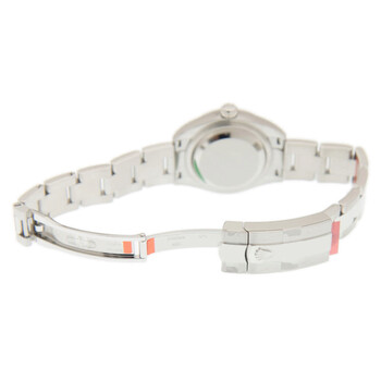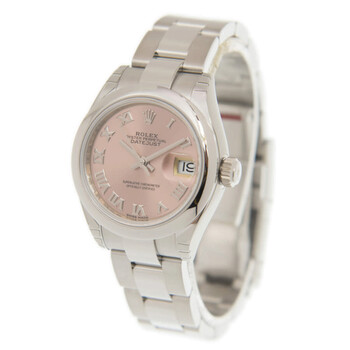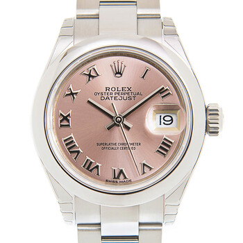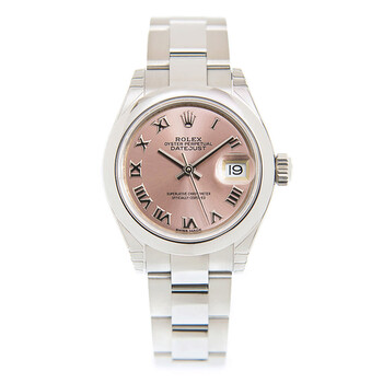 Silver-tone stainless steel case with a silver-tone stainless steel rolex oyster bracelet. Fixed - domed silver-tone stainless steel bezel. Pink dial with silver-tone hands and Roman numeral hour markers. Dial Type: Analog. Date display at the 3 o'clock position. Rolex Calibre 2236 automatic movement with a 55-hour power reserve. Scratch resistant sapphire crystal. Screw down crown. Solid case back. Round case shape. Case size: 28 mm. Fold over with safety release clasp. Water resistant at 100 meters / 330 feet. Functions: date, hour, minute, second. Luxury watch style. Watch label: Swiss Made. Rolex Lady-Datejust Pink Dial Automatic Ladies Oyster Watch 279160PRO.