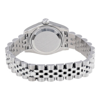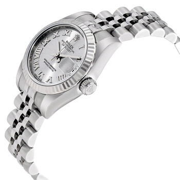 Stainless steel case with a stainless steel Rolex Jubilee bracelet. Fluted 18kt white gold bezel. Rhodium dial with silver-tone hands and Roman numeral hour markers. Dial Type: Analog. Date display at the 3 o'clock position. Rolex calibre 2235 automatic movement with a 48-hour power reserve. Scratch resistant sapphire crystal. Screw down crown. Case size: 26 mm. Round case shape. Concealed crown clasp. Water resistant at 100 meters / 330 feet. Functions: hours, minutes, seconds, date. Luxury watch style. Rolex Lady-Datejust Rhodium Dial Stainless Steel Watch 179174RRJ.