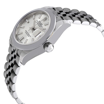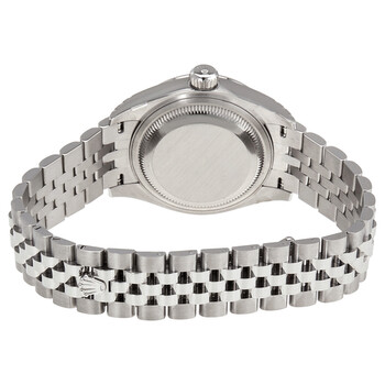 Stainless steel case with a stainless steel Rolex jubilee bracelet. Fixed domed stainless steel bezel. Silver dial with luminous silver-tone hands and index hour markers. Minute markers around the outer rim. Dial Type: Analog. Luminescent hands and markers. Date display at the 3 o'clock position. Rolex calibre 2236 automatic movement, based upon Rolex 2235, containing 31 Jewels, bitting at 28800 vph, and has a power reserve of approximately 55 hours. Scratch resistant sapphire crystal. Screw down crown. Solid case back. Round case shape. Case size: 28 mm. Fold over clasp. Water resistant at 100 meters / 330 feet. Functions: date, hour, minute, second. Lady Datejust 28 Series. Luxury watch style. Watch label: Swiss Made. Rolex Lady-Datejust Silver Dial Automatic Ladies Jubilee Watch 279160SSJ.