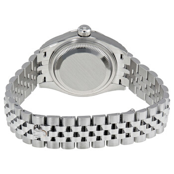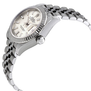 Stainless steel case with a stainless steel Rolex jubilee bracelet. Fixed fluted stainless steel bezel. Silver dial with luminous silver-tone hands and index hour markers. Minute markers around the outer rim. Dial Type: Analog. Luminescent hands and markers. Date display at the 3 o'clock position. Rolex calibre 2236 automatic movement, based upon Rolex 2235, containing 31 Jewels, bitting at 28800 vph, and has a power reserve of approximately 55 hours. Scratch resistant sapphire crystal. Screw down crown. Solid case back. Round case shape. Case size: 28 mm. Fold over clasp. Water resistant at 100 meters / 330 feet. Functions: date, hour, minute, second, chronometer. Lady Datejust 28 Series. Luxury watch style. Watch label: Swiss Made. Rolex Lady-Datejust Silver Dial Automatic Ladies Jubilee Watch 279174SSJ.