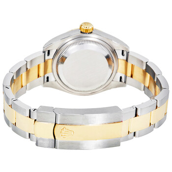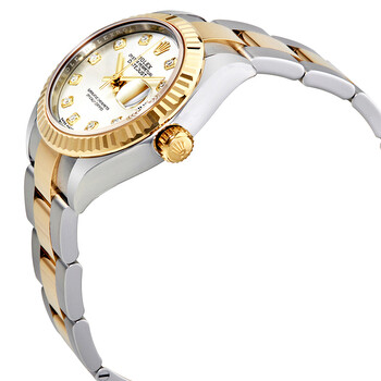 Stainless steel case with a stainless steel Rolex oyster bracelet with 18kt yellow gold center links. Fixed fluted 18kt yellow gold bezel. Silver dial with yellow gold-tone hands and diamond hour markers. Dial Type: Analog. Date display at the 3 o'clock position. Rolex calibre 2236 automatic movement with a 55-hour power reserve. Scratch resistant sapphire crystal. Screw down crown. Solid case back. Case size: 28 mm. Round case shape. Oysterlock clasp. Water resistant at 100 meters / 330 feet. Functions: date, hour, minute, second. Luxury watch style. Watch label: Swiss Made. Rolex Lady-Datejust Silver Diamond Dial Automatic Ladies Watch 279173SDO.