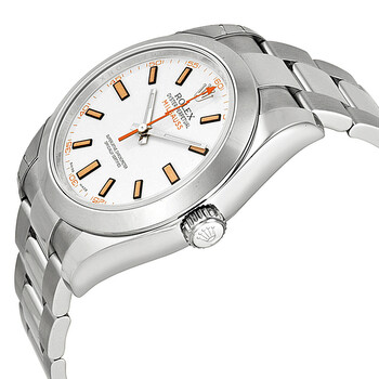Stainless steel case with a stainless steel Rolex oyster bracelet. Fixed domed stainless steel bezel. White dial with luminous silver-tone hands and index hour markers. Minute markers around the outer rim. Dial Type: Analog. Luminescent hands and dial markers. Rolex calibre 3131 automatic movement with a 48-hour power reserve. Scratch resistant sapphire crystal. Screw down crown. Solid case back. Round case shape. Case size: 40 mm. Oysterlock clasp. Water resistant at 100 meters / 330 feet. Functions: hour, minute, second, chronometer. Luxury watch style. Watch label: Swiss Made. Item Variations: 116400-72400. Rolex Milgauss White Dial Stainless Steel Oyster Bracelet Automatic Men's Watch 116400WSO.
