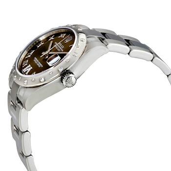 Silver-tone stainless steel case with a silver-tone stainless steel Rolex Oyster bracelet. Fixed, diamond-set silver-tone 18k white gold bezel. Brown dial with silver-tone hands and Roman numeral hour markers. Diamond filled roman numeral iv. Dial Type: Analog. Date display at the 3 o'clock position. Rolex Calibre 2235 automatic movement with a 48-hour power reserve. Scratch resistant sapphire crystal. Case size: 31 mm. Round case shape. Oysterlock clasp. Water resistant at 100 meters / 330 feet. Functions: date, hour, minute, second, chronometer. Luxury watch style. Watch label: Swiss Made. Rolex Oyster Datejst 31 Brown Diamond Automatic Ladies Watch 178344.
