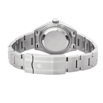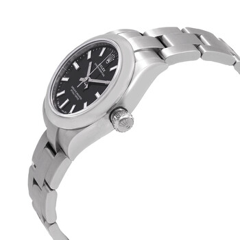 Stainless steel case with a stainless steel bracelet. Fixed stainless steel bezel. Black dial with luminous silver-tone hands and index hour markers. Minute markers around the outer rim. Dial Type: Analog. Luminescent hands and markers. Rolex calibre 2232 automatic movement, containing 31 Jewels, bitting at 28800 vph, and has a power reserve of approximately 55 hours. Scratch resistant sapphire crystal. Screw down crown. Solid case back. Round case shape. Case size: 28 mm. Oysterlock clasp. Water resistant at 100 meters / 330 feet. Functions: hour, minute, second, chronometer. Oyster Perpetual 28 Series. Luxury watch style. Watch label: Swiss Made. Item Variations: M276200-0004. Rolex Oyster Perpetual 28 Automatic Chronometer Black Dial Ladies Watch 276200BKSO.