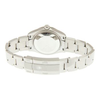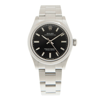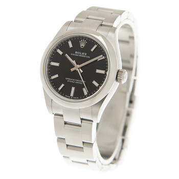 Silver-tone stainless steel case and bracelet. Fixed silver-tone stainless steel bezel. Black dial with silver-tone hands and index hour markers. Minute markers around the outer rim. Dial Type: Analog. Luminescent hands and markers. Rolex Calibre 2232 Automatic movement, containing 31 Jewels, bitting at 28800 vph, and has a power reserve of approximately 55 hours. Scratch resistant sapphire crystal. Screw down crown. Solid case back. Round case shape, case size: 31 mm. Oysterlock clasp. Water resistant at 100 meters / 330 feet. Functions: hour, minute, second, chronometer. Oyster Perpetual 31 Series. Sport watch style. Watch label: Swiss Made. Item Variations: M277200-0002. Rolex Oyster Perpetual 31 Automatic Black Dial Ladies Watch 277200BKSO.
