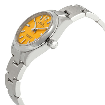 Stainless steel case with a stainless steel bracelet. Fixed stainless steel bezel. Yellow dial with luminous silver-tone hands and index hour markers. Minute markers around the outer rim. Dial Type: Analog. Luminescent hands and markers. Rolex calibre 2232 automatic movement, containing 31 Jewels, bitting at 28800 vph, and has a power reserve of approximately 55 hours. Scratch resistant sapphire crystal. Screw down crown. Solid case back. Round case shape. Case size: 31 mm. Oysterlock clasp. Water resistant at 100 meters / 330 feet. Functions: hour, minute, second, chronometer. Oyster Perpetual 31 Series. Sport watch style. Watch label: Swiss Made. Item Variations: M277200-0005. Rolex Oyster Perpetual 31 Automatic Chronometer Yellow Dial Ladies Watch 277200YLSO.