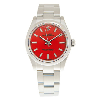 Stainless steel case with a stainless steel bracelet. Fixed stainless steel bezel. Coral red dial with luminous silver-tone hands and index hour markers. Minute markers around the outer rim. Dial Type: Analog. Luminescent hands and markers. Rolex calibre 2232 automatic movement, containing 31 Jewels, bitting at 28800 vph, and has a power reserve of approximately 55 hours. Scratch resistant sapphire crystal. Screw down crown. Solid case back. Round case shape. Case size: 31 mm. Oysterlock clasp. Water resistant at 100 meters / 330 feet. Functions: hour, minute, second, chronometer. Oyster Perpetual 31 Series. Sport watch style. Watch label: Swiss Made. Item Variations: M277200-0008. Rolex Oyster Perpetual 31 Coral Red Dial Automatic Ladies Watch 277200CRLRDSO.