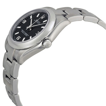 Stainless steel case with a stainless steel rolex oyster bracelet. Fixed domed stainless steel bezel. Black dial with silver-tone hands and index hour markers. Arabic numerals mark the 3, 6 and 9 o'clock position. Minute markers around the outer rim. Dial Type: Analog. Automatic movement with a 48-hour power reserve. Scratch resistant sapphire crystal. Screw down crown. Solid case back. Case size: 31 mm. Round case shape. Oysterlock clasp. Water resistant at 100 meters / 330 feet. Functions: hour, minute, second. Luxury watch style. Watch label: Swiss Made. Item Variations: 177200, 177200-BKSO, Rolex-177200, Rolex-177200-BKSO. Rolex Oyster Perpetual 31 mm Black Dial Stainless Steel Rolex Oyster Automatic Unisex Watch 177200BKASO.