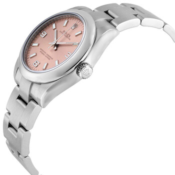 Stainless steel case with a stainless steel rolex oyster bracelet. Fixed - domed stainless steel bezel. Pink dial with silver-tone hands and index hour markers. Arabic numerals mark the 3, 6 and 9 o'clock positions. minute markers around the outer rim. Dial Type: Analog. Automatic movement. Scratch resistant sapphire crystal. Case diameter: 31 mm. Round case shape. Water resistant at 100 meters / 330 feet. Functions: hour, minute, second. Luxury watch style. Watch label: Swiss Made. Rolex Oyster Perpetual 31 mm Pink Dial Stainless Steel Rolex Oyster Automatic Unisex Watch 177200PASO.