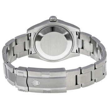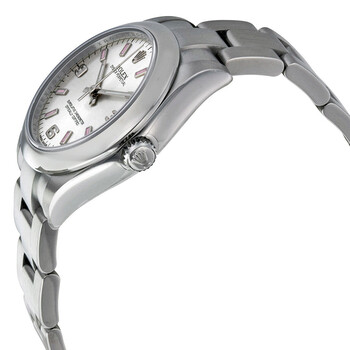 Stainless steel case with a stainless steel Rolex oyster bracelet. Fixed domed stainless steel bezel. Silver dial with luminous silver-tone hands and index hour markers. Arabic numerals mark the 3, 6 and 9 o'clock positions. minute markers around the outer rim. Dial Type: Analog. Luminescent hands and markers. Automatic movement with a 48 Hour power reserve. Scratch resistant sapphire crystal. Screw down crown. Solid case back. Case diameter: 31 mm. Round case shape. Fold over clasp. Water resistant at 100 meters / 330 feet. Functions: hour, minute, second. Luxury watch style. Watch label: Swiss Made. Rolex Oyster Perpetual 31 mm Silver Dial Stainless Steel Rolex Oyster Automatic Ladies Watch 177200SAPSO.