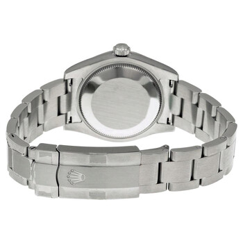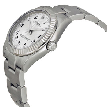 Stainless steel case with a stainless steel rolex oyster bracelet. Fixed - fluted 18k white gold bezel. Silver dial with silver-tone hands and Roman numeral and diamond hour markers. Minute markers around the outer rim. Dial Type: Analog. Automatic movement. Scratch resistant sapphire crystal. Case diameter: 31 mm. Round case shape. Oyster clasp. Water resistant at 100 meters / 330 feet. Functions: hour, minute, second. Luxury watch style. Watch label: Swiss Made. Rolex Oyster Perpetual 31 mm Silver Dial Stainless Steel Rolex Oyster Automatic Unisex Watch 177234SRDO.