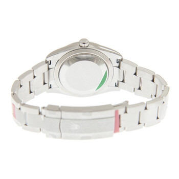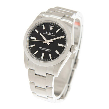 Stainless steel case with a stainless steel bracelet. Fixed stainless steel bezel. Black dial with silver-tone hands and index / small Roman numeral hour markers. Minute markers around the outer rim. Dial Type: Analog. Rolex calibre 2232 automatic movement, containing 31 Jewels, bitting at 28800 vph, and has a power reserve of approximately 55 hours. Scratch resistant sapphire crystal. Screw down crown. Solid case back. Round case shape. Case size: 34 mm. Oysterlock clasp. Water resistant at 100 meters / 330 feet. Functions: hour, minute, second, chronometer. Oyster Perpetual 34 Series. Luxury watch style. Watch label: Swiss Made. Item Variations: M124200-0002. Rolex Oyster Perpetual 34 Automatic Chronometer Black Dial Ladies Watch 124200BKSO.