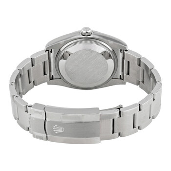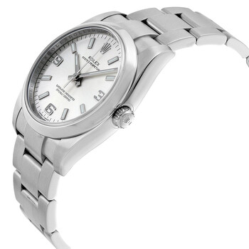 Stainless steel case with a stainless steel Rolex oyster bracelet. Fixed domed stainless steel bezel. Silver dial with luminous silver-tone hands and index hour markers. Arabic numerals mark the 3, 6, and 9 o'clock positions. Minute markers around the outer rim. Dial Type: Analog. Luminescent hands and dial markers. Automatic movement with a 48-hour power reserve. Scratch resistant sapphire crystal. Screw down crown. Solid case back. Case diameter: 34 mm. Round case shape. Deployment clasp. Water resistant at 100 meters / 330 feet. Functions: hour, minute, second. Luxury watch style. Watch label: Swiss Made. Item Variations: 114200, 114200-SASO, Rolex-114200, Rolex-114200-SASO. Rolex Oyster Perpetual 34 Silver Dial Stainless Steel Rolex Oyster Automatic Men's Watch 114200SASO.