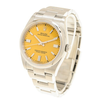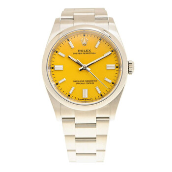 Stainless steel case and bracelet. Fixed stainless steel bezel. Yellow dial with index hour markers. Dial Type: Analog. Luminescent hands and markers. Rolex Calibre 3230 Automatic movement, containing 31 Jewels, bitting at 28800 vph, and has a power reserve of approximately 70 hours. Scratch resistant sapphire crystal. Screw down crown. Solid case back. Round case shape, case size: 36 mm. Oysterlock clasp. Water resistant at 100 meters / 330 feet. Functions: hour, minute, second, chronometer. Oyster Perpetual 36 Series. Sport watch style. Watch label: Swiss Made. Item Variations: M126000-0004. Rolex Oyster Perpetual 36 Automatic Chronometer Yellow Dial Watch 126000YLSO.