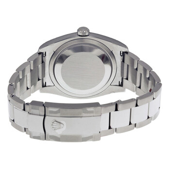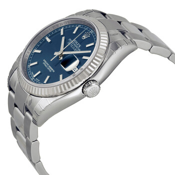 Stainless steel case with a stainless steel Rolex oyster bracelet. Fixed fluted 18kt white gold bezel. Blue dial with luminous silver-tone hands and index / Roman numeral hour markers. Minute markers around the outer rim. Dial Type: Analog. Luminescent hands and markers. Date display at the 3 o'clock position. Automatic movement with a 50-hour power reserve. Scratch resistant sapphire crystal. Screw down crown. Solid case back. Case size: 36 mm. Round case shape. Oysterlock clasp. Water resistant at 100 meters / 330 feet. Functions: date, hour, minute, second. Luxury watch style. Watch label: Swiss Made. Rolex Oyster Perpetual 36 mm Automatic Blue Dial Stainless Steel Rolex Oyster Men's Watch 116234BLSO.