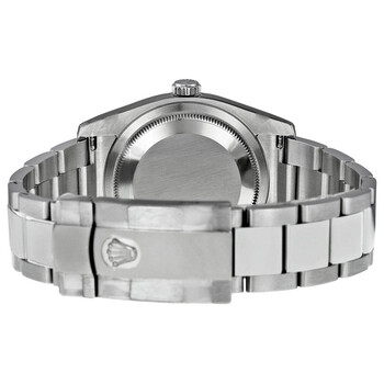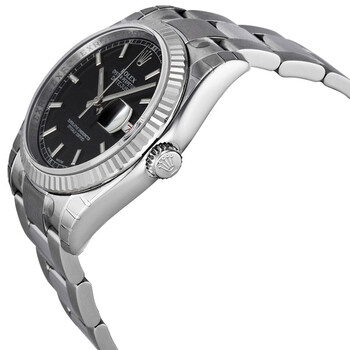 Stainless steel case with a silver-tone stainless steel Rolex oyster bracelet. Fixed fluted 18kt white gold bezel. Black dial with luminous silver-tone hands and index / Roman numeral hour markers. Minute markers. Dial Type: Analog. Luminescent hands and markers. Date display at the 3 o'clock position. Rolex calibre 3135 automatic movement with a 50-hour power reserve. Scratch resistant sapphire crystal. Screw down crown. Solid case back. Case size: 36 mm. Round case shape. Oysterlock clasp. Water resistant at 100 meters / 330 feet. Functions: date, hour, minute, second, chronometer. Luxury watch style. Watch label: Swiss Made. Rolex Oyster Perpetual 36 mm Black Dial Stainless Steel Bracelet Automatic Men's Watch 116234BKSO.