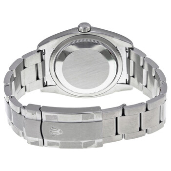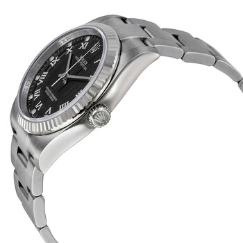 Stainless steel case with a stainless steel rolex oyster bracelet. Fixed - fluted 18k white gold bezel. Black dial with silver-tone hands and Roman numeral and diamond hour markers. Minute markers around the outer rim. Dial Type: Analog. Automatic movement. Scratch resistant sapphire crystal. Screw down crown. Case diameter: 36 mm. Round case shape. Oysterlock clasp. Water resistant at 100 meters / 330 feet. Functions: hour, minute, second. Luxury watch style. Watch label: Swiss Made. Rolex Oyster Perpetual 36 mm Black Dial Stainless Steel Rolex Oyster Automatic Unisex Watch 116034BKRDO.