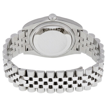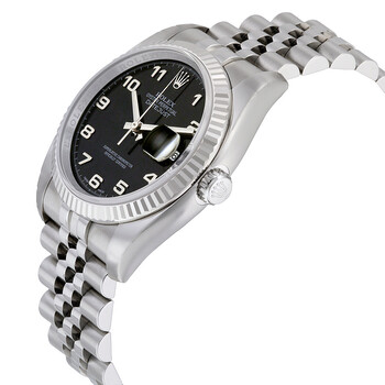 Stainless steel case with a stainless steel rolex jubilee bracelet. Fixed - fluted 18k white gold bezel. Black dial with silver-tone hands and Arabic numeral hour markers. Minute markers around the outer rim. Dial Type: Analog. Date display at the 3 o'clock position. Automatic movement. Scratch resistant sapphire crystal. Screw down crown. Solid case back. Case diameter: 36 mm. Round case shape. Concealed crown clasp. Water resistant at 100 meters / 330 feet. Functions: date, hour, minute, second. Luxury watch style. Watch label: Swiss Made. Rolex Oyster Perpetual 36 mm Black Dial Stainless Steel Rolex Jubilee Automatic Men's Watch 116234BKAJ.