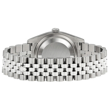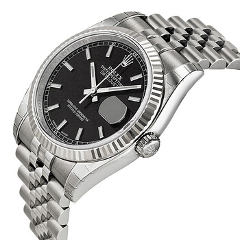 Stainless steel case with a stainless steel Rolex jubilee bracelet. Fixed fluted 18kt white gold bezel. Black dial with silver-tone hands and index / Roman numeral hour markers. Minute markers around the outer rim. Dial Type: Analog. Luminescent hands and dial markers. Date display at the 3 o'clock position. Automatic movement with a 50-hour power reserve. Scratch resistant sapphire crystal. Solid case back. Case diameter: 36 mm. Round case shape. Hidden deployment clasp. Water resistant at 100 meters / 330 feet. Functions: date, hour, minute, second. Luxury watch style. Watch label: Swiss Made. Item Variations: 116234, 116234-BKSJ, Rolex-116234, Rolex-116234-BKSJ. Rolex Oyster Perpetual 36 mm Black Dial Stainless Steel Rolex Jubilee Automatic Men's Watch 116234BKSJ.