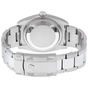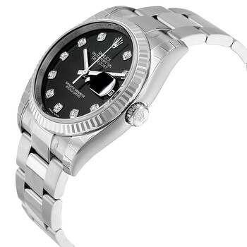 Silver-tone stainless steel case with a silver-tone stainless steel rolex oyster bracelet. Fixed fluted 18kt white gold bezel. Black dial with silver-tone hands and diamond hour markers. Dial Type: Analog. Date display at the 3 o'clock position. Rolex Calibre 3135 automatic movement with a 50-hour power reserve. Scratch resistant sapphire crystal. Screw down crown. Solid case back. Round case shape. Case size: 36 mm. Oysterlock clasp. Water resistant at 100 meters / 330 feet. Functions: date, hour, minute, second, chronometer. Luxury watch style. Watch label: Swiss Made. Item Variations: 116234-72603. Rolex Oyster Perpetual 36 mm Black Diamond Dial Bracelet Automatic Men's Watch 116234BKDO.