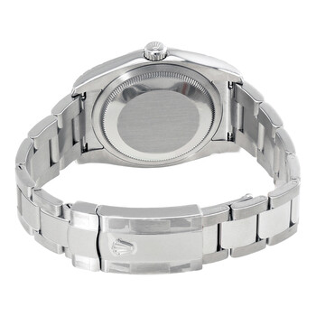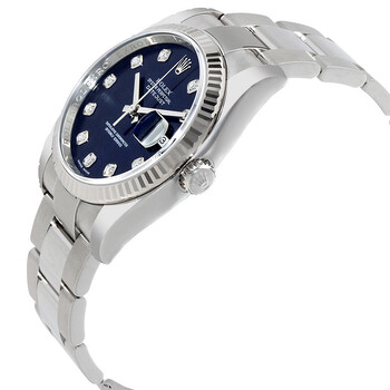 Stainless steel case with a stainless steel Rolex oyster bracelet. Fixed fluted 18kt white gold bezel. Blue dial with silver-tone hands and diamond hour markers. Dial Type: Analog. Date display at the 3 o'clock position. Rolex calibre 3135 automatic movement with a 50-hour power reserve. Scratch resistant sapphire crystal. Screw down crown. Solid case back. Case size: 36 mm. Round case shape. Oysterlock clasp. Water resistant at 100 meters / 330 feet. Functions: date, hour, minute, second. Luxury watch style. Watch label: Swiss Made. Rolex Oyster Perpetual 36 mm Blue Dial Stainless Steel Rolex Oyster Automatic Ladies Watch 116234BLDO.