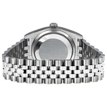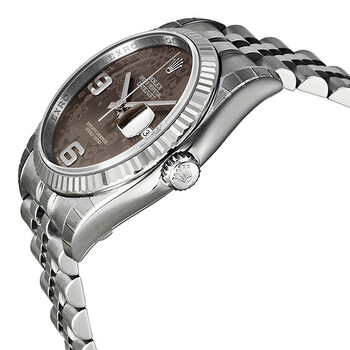 Stainless steel case with a stainless steel Rolex jubilee bracelet. Fixed fluted 18kt white gold bezel. Bronze dial with silver-tone hands. Oversized Arabic numerals 9 and 6 hour markers. Dial Type: Analog. Date display at the 3 o'clock position. Automatic movement with a 50-hour power reserve. Scratch resistant sapphire crystal. Screw down crown. Solid case back. Case diameter: 36 mm. Round case shape. Concealed crown clasp. Water resistant at 100 meters / 330 feet. Functions: date, hour, minute, second. Dress watch style. Watch label: Swiss Made. Rolex Oyster Perpetual 36 mm Bronze Dial Stainless Steel Rolex Jubilee Automatic Ladies Watch 116234BRAFJ.