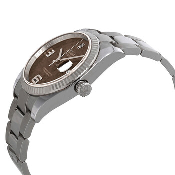 Stainless steel case with a stainless steel rolex oyster bracelet. Fixed - fluted 18k white gold bezel. Brown floral dial with silver-tone hands. Arabic numerals mark the 6 and 9 o'clock positions. Dial Type: Analog. Date display at the 3 o'clock position. Automatic movement. Scratch resistant sapphire crystal. Screw down crown. Case diameter: 36 mm. Case thickness: 13 mm. Round case shape. Band width: 19.5 mm. Fold over with safety release clasp. Water resistant at 100 meters / 330 feet. Functions: date, hour, minute, second. Luxury watch style. Watch label: Swiss Made. Rolex Oyster Perpetual 36 mm Brown Floral Dial Stainless Steel Rolex Oyster Automatic Ladies Watch 116234BRAFO.