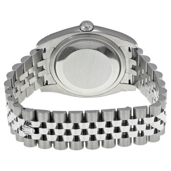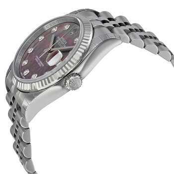 Stainless steel case with a stainless steel Rolex jubilee bracelet. Fixed fluted 18kt white gold bezel. Dark mother of pearl dial with silver-tone hands and diamond hour markers. Dial Type: Analog. Date display at the 3 o'clock position. Automatic movement with a 50-hour power reserve. Scratch resistant sapphire crystal. Screw down crown. Solid case back. Case diameter: 36 mm. Round case shape. Concealed crown clasp. Water resistant at 100 meters / 330 feet. Functions: date, hour, minute, second. Luxury watch style. Watch label: Swiss Made. Rolex Oyster Perpetual 36 mm Dark Mother of Pearl Dial Stainless Steel Rolex Jubilee Automatic Men's Watch 116234BKMDJ.
