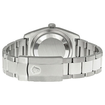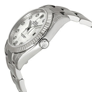 Stainless steel case with a stainless steel Rolex oyster bracelet. Fixed fluted 18kt white gold bezel. Mother of pearl dial with silver-tone hands and diamond hour markers. Dial Type: Analog. Date display at the 3 o'clock position. Automatic movement with a 50-hour power reserve. Scratch resistant sapphire crystal. Screw down crown. Case diameter: 36 mm. Round case shape. Oysterclasp clasp. Water resistant at 100 meters / 330 feet. Functions: date, hour, minute, second. Luxury watch style. Watch label: Swiss Made. Rolex Oyster Perpetual 36 mm Mother of Pearl Dial Stainless Steel Rolex Oyster Automatic Unisex Watch 116234MDO.