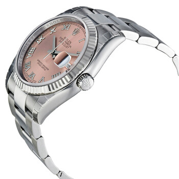 Stainless steel case with a stainless steel rolex oyster bracelet. Fixed fluted 18k white gold bezel. Pink dial with silver-tone hands and Roman numeral hour markers. Minute markers around the outer rim. Dial Type: Analog. Date display at the 3 o'clock position. Automatic movement with a 50-hour power reserve. Scratch resistant sapphire crystal. Case diameter: 36 mm. Round case shape. Deployment clasp. Water resistant at 100 meters / 330 feet. Functions: date, hour, minute, second. Luxury watch style. Watch label: Swiss Made. Item Variations: 116234, 116234-PRO, Rolex-116234, Rolex-116234-PRO. Rolex Oyster Perpetual 36 mm Pink Dial Stainless Steel Rolex Oyster Automatic Men's Watch 116234PRO.