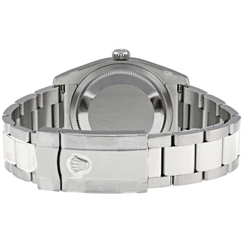 Stainless steel case with a stainless steel Rolex oyster bracelet. Fixed fluted 18kt white gold bezel. Rhodium dial with silver-tone hands and Roman numeral hour markers. Minute markers around the outer rim. Dial Type: Analog. Date display at the 3 o'clock position. Automatic movement with a 50-hour power reserve. Scratch resistant sapphire crystal. Screw down crown. Solid case back. Case diameter: 36 mm. Round case shape. Fold over with safety clasp. Water resistant at 100 meters / 330 feet. Functions: date, hour, minute, second. Luxury watch style. Watch label: Swiss Made. Rolex Oyster Perpetual 36 mm Rhodium Dial Stainless Steel Rolex Oyster Automatic Men's Watch 116234RRO.
