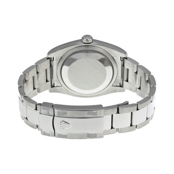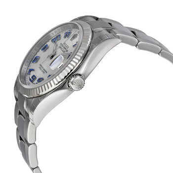 Stainless steel case with a stainless steel Rolex oyster bracelet. Fixed fluted 18kt white gold bezel. Silver dial with luminous silver-tone hands and blue Arabic numeral hour markers. Minute markers around the outer rim. Dial Type: Analog. Luminescent hands and markers. Date display at the 3 o'clock position. Rolex calibre 3135 automatic movement with a 50-hour power reserve. Scratch resistant sapphire crystal. Screw down crown. Solid case back. Round case shape. Case size: 36 mm. Oysterlock clasp. Water resistant at 100 meters / 330 feet. Functions: date, hour, minute, second, chronometer. Luxury watch style. Watch label: Swiss Made. Item Variations: 116234-72603. Rolex Oyster Perpetual 36 mm Silver Dial Stainless Steel Bracelet Automatic Men's Watch 116234SBLAO.