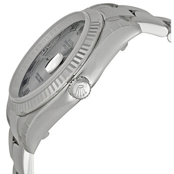 Stainless steel case with a stainless steel rolex oyster bracelet. Fixed - fluted 18k white gold bezel. Silver dial with silver-tone hands and Roman hour markers. Minute markers around the outer rim. Dial Type: Analog. Luminescent hands. Date display at the 3 o'clock position. Automatic movement. Scratch resistant sapphire crystal. Case diameter: 36 mm. Round case shape. Deployment clasp. Water resistant at 100 meters / 330 feet. Functions: date, hour, minute, second. Luxury watch style. Watch label: Swiss Made. Rolex Oyster Perpetual 36 mm Silver Dial Stainless Steel Rolex Oyster Automatic Men's Watch 116234SRO.