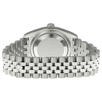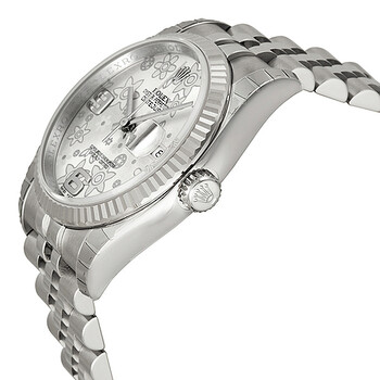 Stainless steel case with a stainless steel rolex jubilee bracelet. Fixed - fluted 18k white gold bezel. Silver floral dial with silver-tone hands. Arabic numerals mark the 6 and 9 o'clock positions. Dial Type: Analog. Date display at the 3 o'clock position. Automatic movement. Scratch resistant sapphire crystal. Screw down crown. Solid case back. Case diameter: 36 mm. Round case shape. Deployment with push button clasp. Water resistant at 100 meters / 330 feet. Functions: date, hour, minute, second. Luxury watch style. Watch label: Swiss Made. Rolex Oyster Perpetual 36 mm Silver floral Dial Stainless Steel Rolex Jubilee Automatic Ladies Watch 116234SAFJ.
