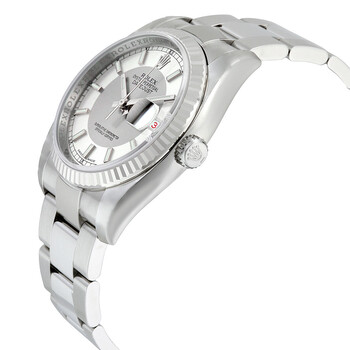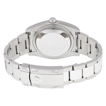 Stainless steel case with a stainless steel Rolex oyster bracelet. Fixed fluted 18k white gold bezel. Silver rhodium dial with silver-tone hands and index hour markers. Minute markers around the outer rim. Dial Type: Analog. Luminescent hands and markers. Date display at the 3 o'clock position. Automatic movement. Caliber 3135 engine. Scratch resistant sapphire crystal. Screw down crown. Solid case back. Case diameter: 36 mm. Round case shape. Water resistant at 100 meters / 330 feet. Functions: date, hour, minute, second. Luxury watch style. Watch label: Swiss Made. Rolex Oyster Perpetual 36 mm Silver Rhodium Dial Stainless Steel Rolex Oyster Automatic Ladies Watch 116234SRSO.