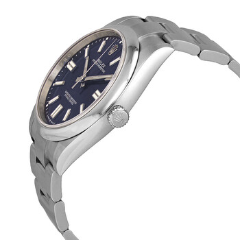Stainless steel case with a stainless steel bracelet. Fixed stainless steel bezel. Blue dial with luminous silver-tone hands and index hour markers. Minute markers around the outer rim. Dial Type: Analog. Luminescent hands and markers. Rolex calibre 3230 Automatic movement, containing 31 Jewels, bitting at 28800 vph, and has a power reserve of approximately 70 hours. Scratch resistant sapphire crystal. Screw down crown. Solid case back. Round case shape. Case size: 41 mm. Oysterlock clasp. Water resistant at 100 meters / 330 feet. Functions: hour, minute, second, chronometer. Oyster Perpetual 41 Series. Sport watch style. Watch label: Swiss Made. Item Variations: M124300-0003. Rolex Oyster Perpetual 41 Automatic Blue Dial Men's Watch 124300BLSO.