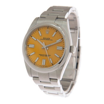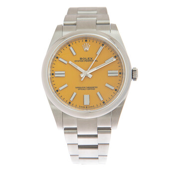 Stainless steel case and bracelet. Fixed stainless steel bezel. Yellow dial with index hour markers. Dial Type: Analog. Rolex Calibre 3230 Automatic movement, containing 31 Jewels, bitting at 28800 vph, and has a power reserve of approximately 70 hours. Scratch resistant sapphire crystal. Screw down crown. Solid case back. Round case shape, case size: 41 mm. Oysterlock clasp. Water resistant at 100 meters / 330 feet. Functions: hour, minute, second, chronometer. Oyster Perpetual 41 Series. Sport watch style. Watch label: Swiss Made. Item Variations: M124300-0004. Rolex Oyster Perpetual 41 Automatic Yellow Dial Men's Watch 124300SSO.