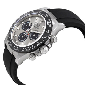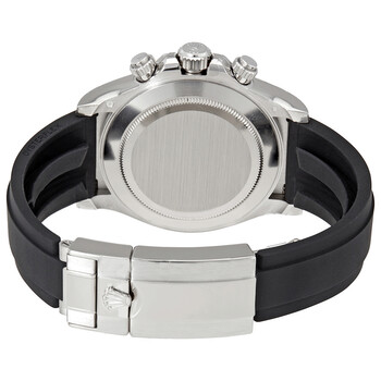 18kt white gold case with a black Rolex oysterflex strap. Fixed 18kt white gold bezel with a black cerachrom top ring. Steel dial with luminous silver-tone hands and index hour markers. Minute markers around the outer rim. Dial Type: Analog. Luminescent hands and markers. Chronograph - three sub-dials displaying: 60 second, 30 minute and 12 hours. Rolex calibre 4130 automatic movement with a 72-hour power reserve. Scratch resistant sapphire crystal. Screw down crown. Solid case back. Round case shape. Case size: 40 mm. Oysterlock clasp. Water resistant at 100 meters / 330 feet. Functions: chronograph, tachymeter, hour, minute, second. Luxury watch style. Watch label: Swiss Made. Rolex Oyster Perpetual Cosmograph Daytona 18K White Gold Men's Chronograph Watch 116519LN.
