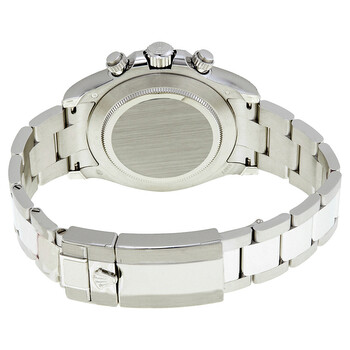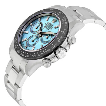 White platinum case with a white platinum oyster bracelet. Fixed chestnut brown ceramic bezel showing tachymeter markings. Ice blue dial with luminous silver-tone hands and diamond hour markers. Minute markers around the outer rim. Dial Type: Analog. Luminescent hands. Chronograph - three sub-dials displaying: 60 second, 30 minute and 12 hour. Rolex calibre 4130 automatic movement, based upon Rolex 4030, containing 44 Jewels, bitting at 28800 vph, and has a power reserve of approximately 72 hours. Scratch resistant sapphire crystal. Screw down crown. Solid case back. Round case shape. Case size: 40 mm. Oysterlock clasp. Water resistant at 100 meters / 330 feet. Functions: chronograph, hour, minute, second, chronometer. Cosmograph Daytona Series. Luxury watch style. Watch label: Swiss Made. Item Variations: 116506-78596, M116506-0002. Rolex Oyster Perpetual Cosmograph Daytona Ice Blue Dial Automatic Men's Chronograph Watch 116506BLDO.