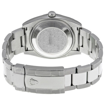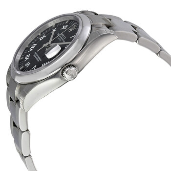 Stainless steel case with a stainless steel rolex oyster bracelet. Fixed - stainless steel bezel. Black dial with silver-tone hands and Roman numeral hour markers. Minute markers around the outer rim. Dial Type: Analog. Luminescent hands and dial markers. Date display at the 3 o'clock position. Automatic movement. Scratch resistant sapphire crystal. Case diameter: 34 mm. Round case shape. Deployment clasp. Water resistant at 100 meters / 330 feet. Functions: date, hour, minute, second. Luxury watch style. Watch label: Swiss Made. Item Variations: 115200, 11520, 115200bkro. Rolex Oyster Perpetual Date 34 Black Dial Stainless Steel Rolex Oyster Automatic Men's Watch 115200BKRO.