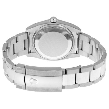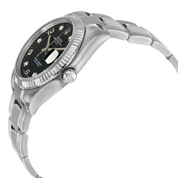 Stainless steel case with a stainless steel Rolex oyster bracelet. Fixed fluted 18kt white gold bezel. Black dial with silver-tone hands and alternating diamond and Arabic numeral hour markers. Minute markers around the outer rim. Dial Type: Analog. Date display at the 3 o'clock position. Rolex calibre 3135 automatic movement with a 48-hour power reserve. Scratch resistant sapphire crystal. Screw down crown. Solid case back. Case size: 34 mm. Round case shape. Oysterlock clasp. Water resistant at 100 meters / 330 feet. Functions: date, hour, minute, second, chronometer. Dress watch style. Watch label: Swiss Made. Rolex Oyster Perpetual Date 34 Black Dial Stainless Steel Rolex Oyster Automatic Men's Watch 115234BKDO.