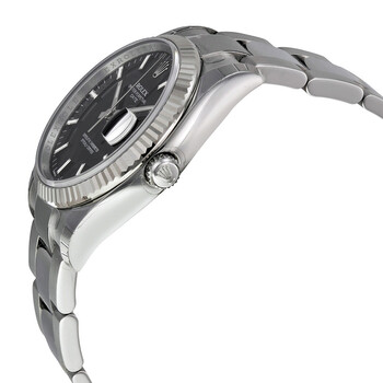 Stainless steel case with a stainless steel Rolex oyster bracelet. Fixed fluted 18kt white gold bezel. Black dial with luminous silver-tone hands and stick hour markers. Minute markers around the outer rim. Dial Type: Analog. Date display at the 3 o'clock position. Rolex calibre 3135 automatic movement with a 48-hour power reserve. Scratch resistant sapphire crystal. Screw down crown. Solid case back. Case size: 34 mm. Round case shape. Oysterlock clasp. Water resistant at 100 meters / 330 feet. Functions: date, hour, minute, second. Luxury watch style. Watch label: Swiss Made. Rolex Oyster Perpetual Date 34 Black Dial Stainless Steel Rolex Oyster Automatic Men's Watch 115234BKSO.