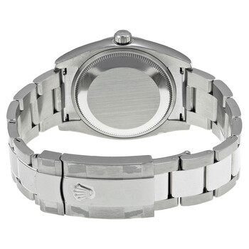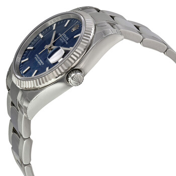 Stainless steel case with a stainless steel Rolex oyster bracelet. Fixed fluted 18kt white gold bezel. Blue dial with silver-tone hands and index hour markers. Minute markers around the outer rim. Dial Type: Analog. Luminescent hands and markers. Date display at the 3 o'clock position. Rolex calibre 3135 automatic movement with a 48-hour power reserve. Scratch resistant sapphire crystal. Screw down crown. Solid case back. Case size: 34 mm. Round case shape. Oysterlock clasp. Water resistant at 100 meters / 330 feet. Functions: date, hour, minute, second. Luxury watch style. Watch label: Swiss Made. Rolex Oyster Perpetual Date 34 Blue Dial Stainless Steel Rolex Oyster Automatic Men's Watch 115234BLSO.